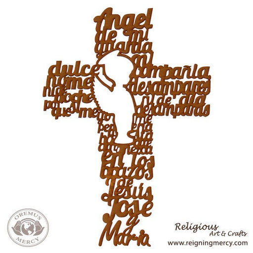 Laser-cut wooden cross featuring the “Guardian Angel Prayer” (Spanish). Measures 17″ x 11″