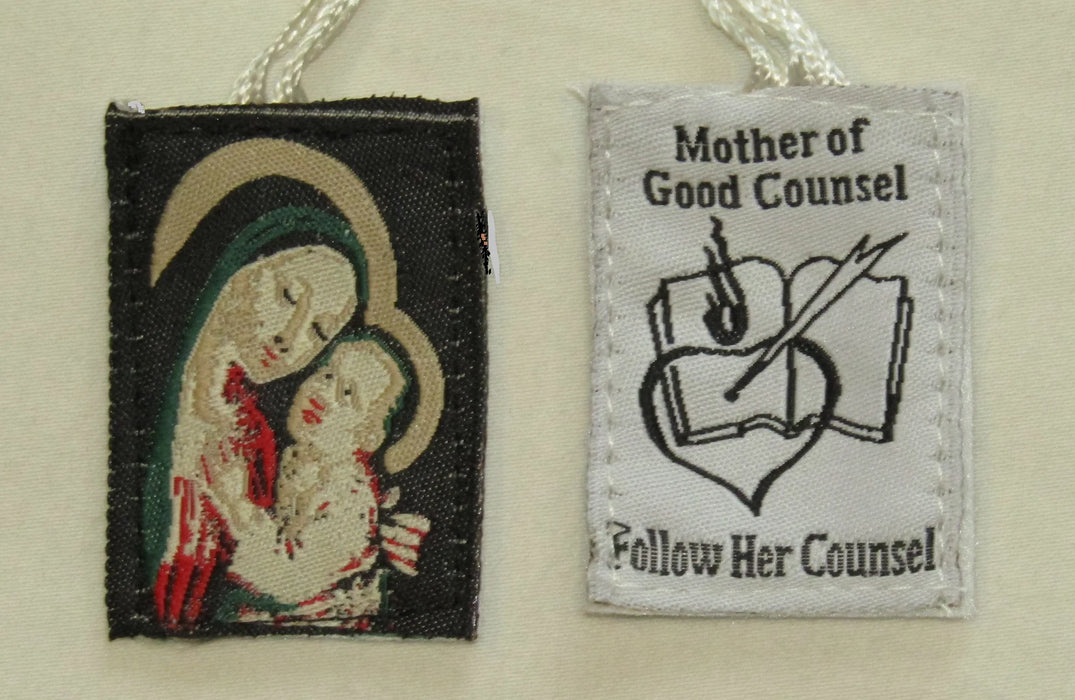 The Our Lady of Good Counsel Scapular is a beautiful and reverent devotional garment, featuring a detailed woven image of Our Lady in serene, vibrant tapestry. This scapular is a meaningful symbol of Marian devotion and guidance, honoring the gentle wisdom and intercession of the Blessed Mother.