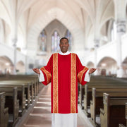 This Taormina Collection Gothic Style Dalmatic features a round neck, and a high quality gold lace edging. Perfect for special occasions and church services. Made from dura fabric, this dalmatic drapes beautifully.