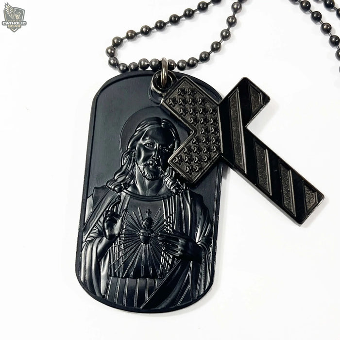 Sacred Heart Dog Tag and American Flag Cross - Powerful expression of the undying love of the Sacred Heart and love for our great nation.