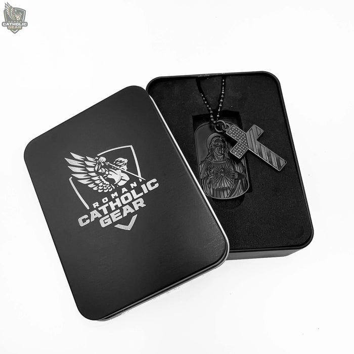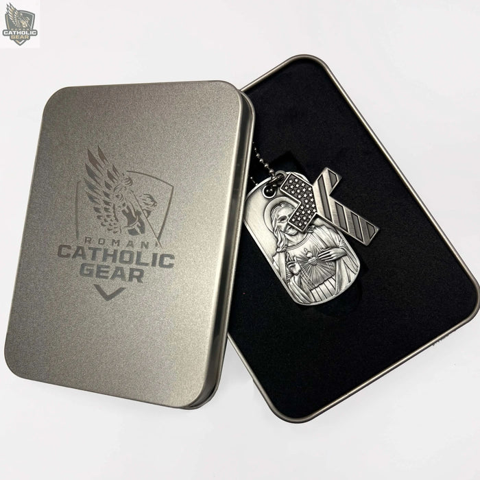 Wear this “Catholic Dog Tag” proudly to identify your devotion to the Sacred Heart and strong commitment to bring love and peace to our great nation. This dog tag is a beautifully crafted 2-sided scapular that includes detailed, 3D images of both the Sacred Heart of Jesus and the Virgin Mary. It is layered with an American Flag Cross that can be worn on either side of the dog tag or removed and worn by itself. The customary ball chain is 30” in length and can be cut to any size. The dog tag and cross come packaged in a versatile, reusable, rectangular tin with removable padding to store your dog tag and cross. Great for travel.