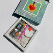 Inside the box you'll find a stretched and framed artwork of the Sacred Heart, colored gems in labeled pouches that match the numbers on the artwork, a gemming tool, gem tool wax, and a gem tray.
