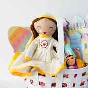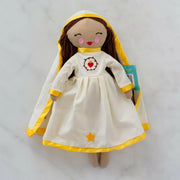 This lovely doll was inspired by one of the most beloved apparitions of the Blessed Mother, Our Lady of Fatima. She is clothed in a cream dress and veil with gold satin trim. Each doll is hand-sewn and finished with lovely embroidery.