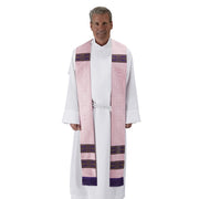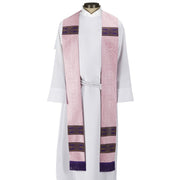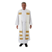 The Avignon Collection Trinity Overlay Stole is made with polyester jacquard and satin. The stole features a floral damask base fabric with gold metallic jacquard banding, dyed fringe, and matching satin backing.