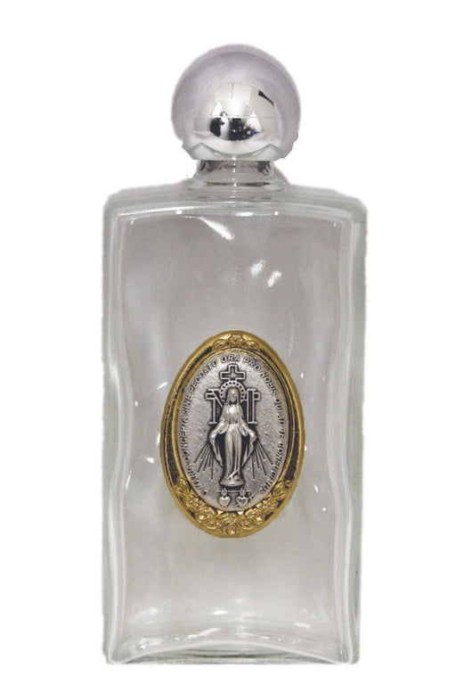 Miraculous Medal large glass holy water bottle. •2x5x1.25" •Holds 8 fluid ounces •MADE IN ITALY •Item # WB13-MM