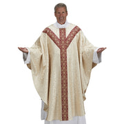 Esta Casulla Semigótica de la Colección Monreale está confeccionada con poliéster puro con un elegante diseño de brocado de inspiración italiana. Esto incluye estola interior a juego.