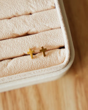 The Dainty Cross Stud Earrings in gold add a meaningful and elegant touch to your everyday look.