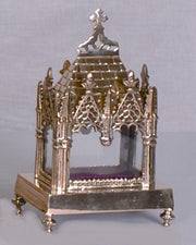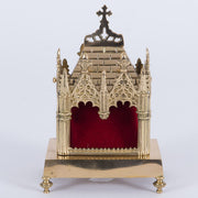 Este Santuario de Reliquias de Latón está hecho con belleza y elegancia. Este relicario está hecho para contener las reliquias de los santos u otros objetos sagrados. Presenta un diseño que recuerda a los elementos arquitectónicos de las catedrales del Viejo Mundo. Hecho a mano en latón macizo pulido y mide 7,5 pulgadas de altura.