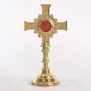 Este relicario de latón macizo en forma de cruz de varias capas está hecho con belleza y elegancia. Este relicario está hecho para contener las reliquias de los santos u otros objetos sagrados. Presenta un diseño que recuerda a los elementos arquitectónicos de las catedrales del Viejo Mundo. Hecho a mano en latón macizo pulido y mide 13 pulgadas de altura.