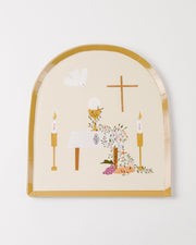 The Communion Dinner Plates are in the shape of an arch to represent the sacred space. The dove descends as the Holy Spirit to the Eucharist and Chalice. The flowers ascend from the earthly bread and grapes.