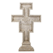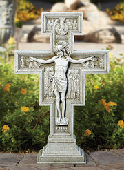 El crucifijo del Jardín de San Damián, inspirado en el gesto final de amor de Jesús, es una reproducción de la enorme cruz románica ante la cual se dice que San Francisco de Asís recibió el encargo del Señor de reconstruir la Iglesia. Este crucifijo es una escultura artística de resina de piedra natural con acabado frontal y posterior. En el reverso dice: "Ve, repara mi iglesia".