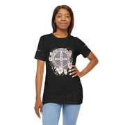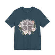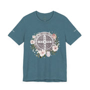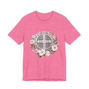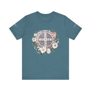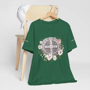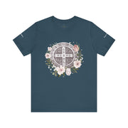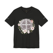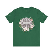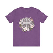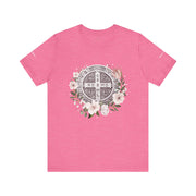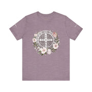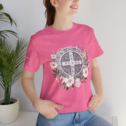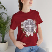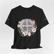 Embrace faith and style with this beautifully designed St. Benedict Medal T-Shirt, featuring an elegant floral arrangement surrounding the powerful St. Benedict Medal. This jersey short sleeve tee offers comfort, breathability, and a timeless design, perfect for everyday wear or as a meaningful gift for loved ones.