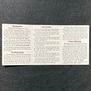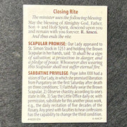 Investiture in the Scapular; The minister places the Scapular over the shoulder of the candidate, saying, "Receive this scapular by which you enter the family of the Brothers of the Blessed Virgin Mary of Mount Carmel; wear it as a sign of the motherly protection of the Virgin, and of your pledge to imitate and to serve her." Also included are: -Opening rite -Intercessions -Prayer of Blessings -The word of God -Scapular Promise Fits perfectly inside any standard sized wallet or checkbook Roll-Fold Prayer Card Pamphlet Sturdy card stock w/ gloss finish Measures: 3.5" x 2.5" MOQ: 25 (25 pamphlets/1pk)