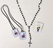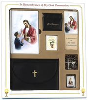 This Premier Boxed Set for boys contains a Sacred Heart Edition First Mass Book, elegant pearlized rosary, laminated scapular, enamel pin, laminated bookmark and black imitation leather wallet with gold detail and matching secure, pinch-top rosary case.