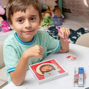Inside the box you'll find a stretched and framed artwork of Jesus, colored gems in labeled pouches that match the numbers on the artwork, a gemming tool, gem tool wax, and a gem tray.