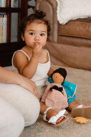 - a cotton dress sized perfectly for our custom doll with a hand drawn pattern like her original dress